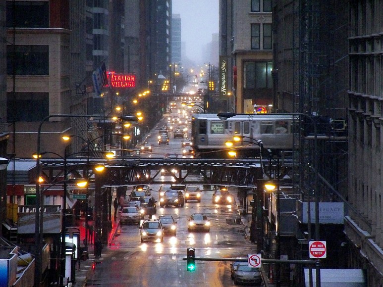 The hustle and bustle of an early Saturday evening in the rain-soaked city.