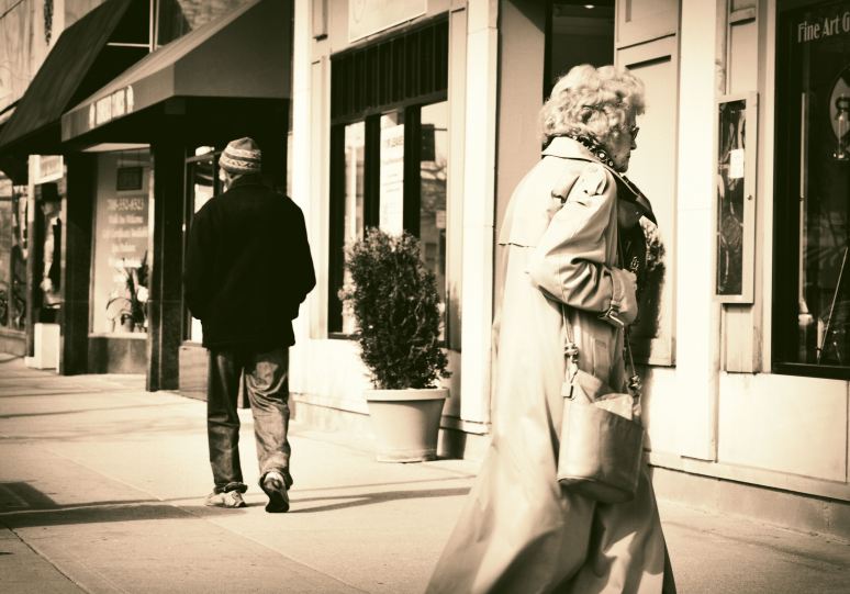 1. You know what I like about street photography like this? It captures an entire culture. Forty years from now you will be able to look back at it, maybe rather nostalgically, and think how different the clothes were back then. You will be able to see the changing architecture and something about the affluence of the times. Your lady seems to look pretty well off. I wonder if her counterpart in 2050 will have such fine clothing? And what coats and purses will look like then? I wonder if blue jeans will still be the leggings of choice for the homeless? And will knit headwarmers like your man is wearing still be around? They weren’t in the street images from the 50’s that my dad took in Dallas. And how will ladies wear their hair five decades from now? One thing for sure, there will be changes, and your images will have captured a flavor of life that looks quaint to future generations. Neat photograph and I hope you keep walking the streets.