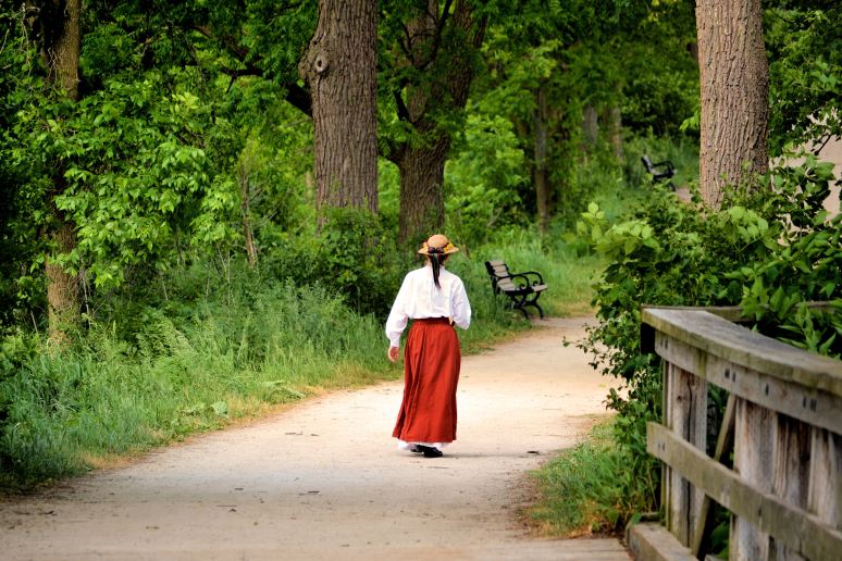 Old-fashioned charm! I like the red skirt midst all that greenery.